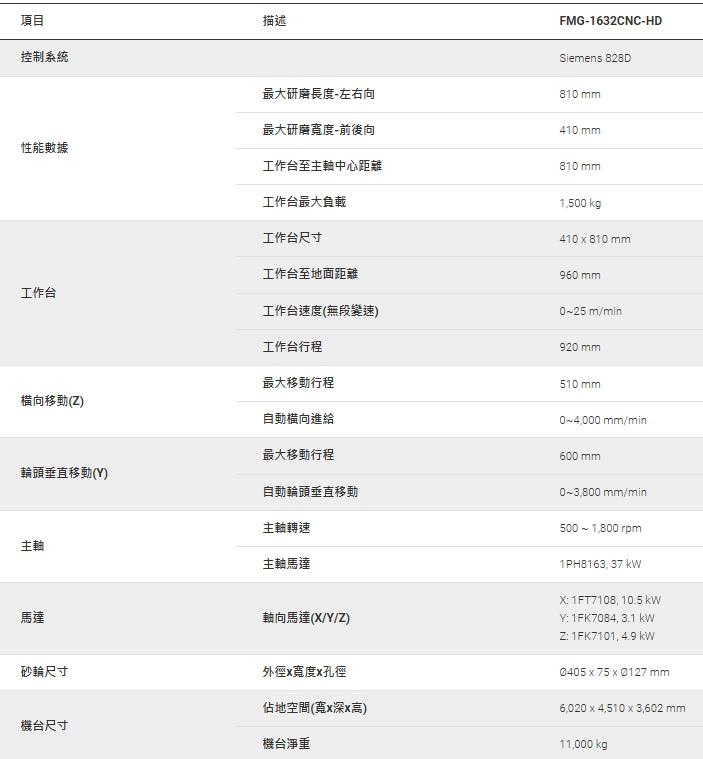 FMG-1632CNC-HD是一款具有高精度、多軸伺服傳動、動柱,強力重切型CNC磨床。非常適合用於各種複雜形狀、難磨材料之成型研磨。